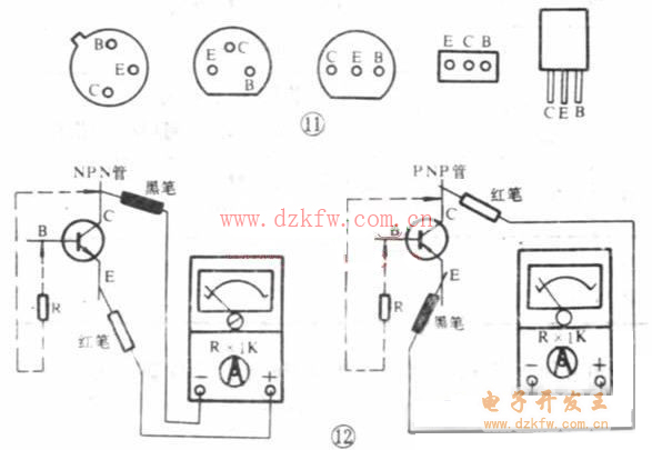 在測IcEo基礎(chǔ)上,再接一個(gè)lOkΩ(硅管)或20kΩ(鍺管)電阻,如圖12中虛線所示.便可檢查管子放大系數(shù)Hfe。接上電阻后表針示值變小越多,說明管子hFE越大;若阻值不變或改變很小。說明管子損壞或放大能力很差。實(shí)測中也可用手(需較濕)捏牢B、C極來代替電阻.這是利用人體電阻的一種方法。現(xiàn)在許多萬用表均設(shè)有三極管測試擋(孔),可直接粗略測出管子hFE及判斷出B、E、c極.實(shí)踐中應(yīng)盡量采用這種測試方法.