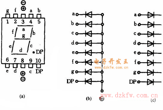 圖中(b)屬于共陽極結構,(c)采用共陰極結構。a~g是7個筆段電極,DP為小數點。另有一種字高為7.6mm的超小型LED數碼管,管腳從左右兩排引出,小數點則是獨立的。