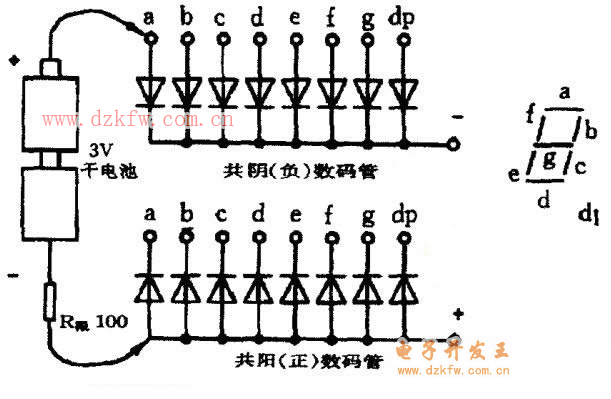 LED數碼管外觀要求顏色均勻、無局部變色及無氣泡等,在業余條件下可用干電池進一步檢測。如下圖所示。以共陰極數碼管為例介紹檢測方法。