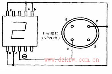 利用數字萬用表的HFE插口能夠方便地檢查LED數碼管的發光情況。選擇NPN檔時,C孔帶正電,E孔帶負電。例如檢測LTS547R型共剛極LED數碼管時,從E孔插入一根單股細導線,導線引出端接一極(第③腳與第⑧腳在內部連通,可任選一個作為-);再從c孔引出一根導線依次接觸各筆段。