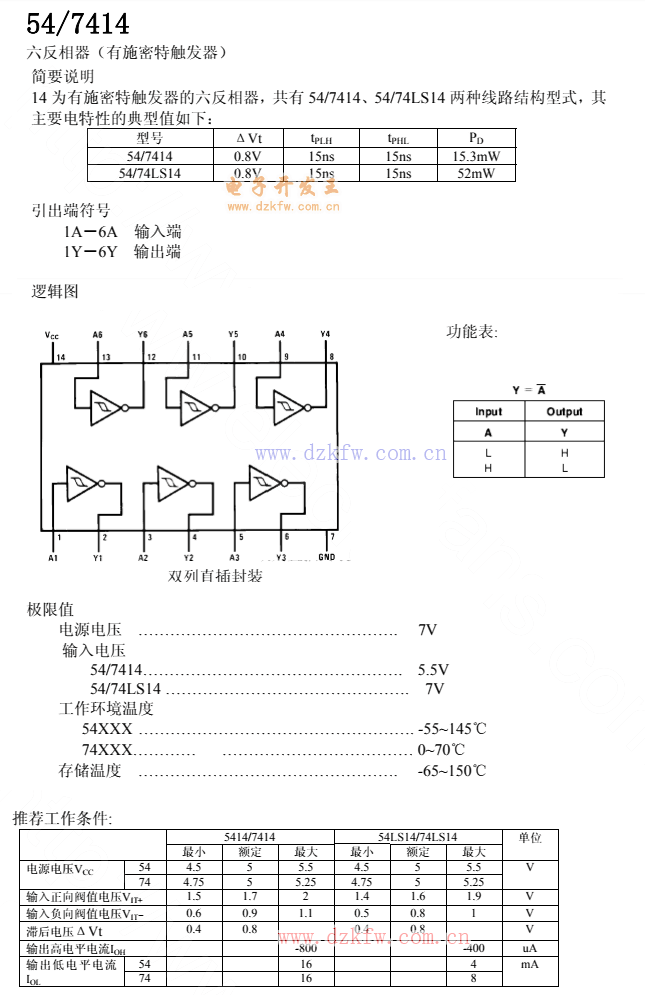 非門芯片74LS14 是一個6反向器, 引腳定義如下圖:
