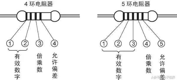 技巧2:棕色環是否是誤差標志的判別。棕色環既常用做誤差環,又常作為有效數字環,且常常在第一環和最末一環中同時出現,使人很難識別誰是第一環。在實踐中,可以按照色環之間的間隔加以判別:比如對于一個五道色環的電阻而言,第五環和第四環之間的間隔比第一環和第二環之間的間隔要寬一些,據此可判定色環的排列順序。