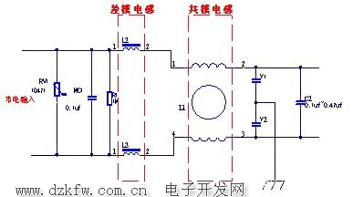 如下圖是某EMI濾波電路部分電路圖,其中L1是共模電感,它有1-4總共四個引腳,而L2和L3是差模電感,它分別有1-2兩個引腳,可以看出差模電感經過交流電源電流,這種差模電感能夠耐很大的交流電流,一般成對出現。