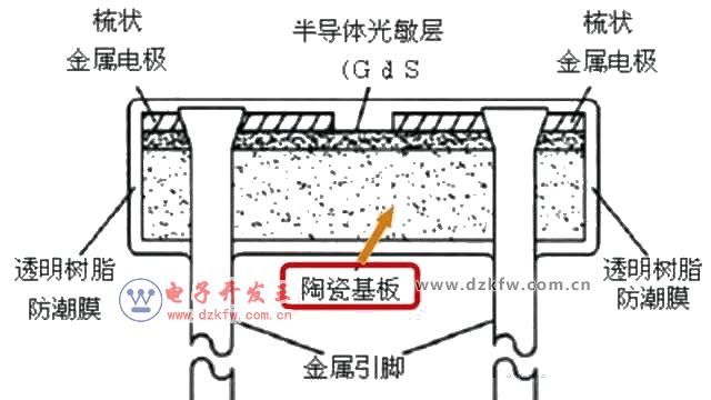 光敏電阻器的結(jié)構(gòu)入上圖所示,它的結(jié)構(gòu)包括光敏層、玻璃基片(或樹脂防潮膜)及電極。