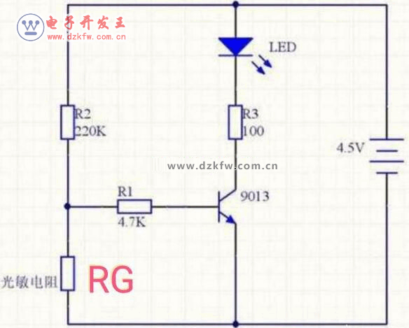 上圖為光敏電阻的外形,其與普通電阻一樣,只有兩個引腳,并且引腳是無極性的,使用時不需要考慮其引腳極性。由于這種電阻的阻值會隨著光線強(qiáng)弱而變化,故光敏電阻在光控電路中用的很廣。下圖所示電路為光敏電阻及一個三極管構(gòu)成的簡易光控LED燈,其可以使LED小燈在晚上自動點(diǎn)亮。圖中的RG即為光敏電阻,白天光線強(qiáng),RG阻值很小,三極管截止,LED小燈不亮。晚上光線變得很弱,RG阻值增大,三極管飽和導(dǎo)通,LED點(diǎn)亮。這個電路之所以能夠?qū)崿F(xiàn)光控,就是利用光敏電阻阻值會隨著光線強(qiáng)弱而變化來實(shí)現(xiàn)的。
