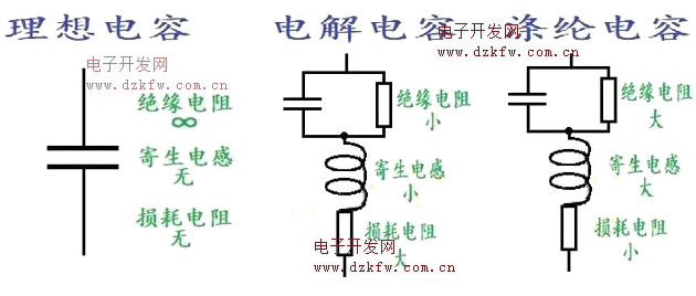 為了便于理解,我們首先把理想電容和電解電容、滌綸電容的性能,用等效電路圖的方式作一下比較: