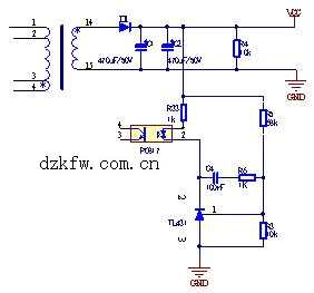 下圖是某反激式開關(guān)電源反饋回路一部分原理圖,在反擊式電源很多工程師會采取光耦PC817與TL431精密穩(wěn)壓源作為主要元器件組成電壓反饋回路,光耦PC817的輸入以開關(guān)電源輸出電壓為輸入端,當(dāng)輸出電壓發(fā)生波動時候,由R5和R3構(gòu)成的分壓取樣電壓與TL431的2.5V基準(zhǔn)電壓進(jìn)行比較,這樣得到一個誤差電壓,這個誤差電壓作為PC817光耦輸入電電壓,R33是光耦限流電阻,在一定的誤差電壓之下得到一個輸入電流,PC817一般最小的輸入電流要大于3mA,為了保證可靠,最好設(shè)計在大于3mA以上,反饋電流通過光電耦合去反饋到開關(guān)電源IC的控制端,從而控制開關(guān)輸出PWM信號,最終使輸出電壓維持在恒定值。