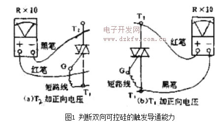 檢查觸發導通能力。萬用表置于Rx10檔:①如圖,1(a)所示, 用黑表筆接主電極T2,紅表筆接T1,即給T2加正向電壓,再用短路線將G與T1(或T2)短接一下后離開,如果表頭指針發生了較大偏轉并停留在一固定位置,說明雙向可控硅中的一部分(其中一個單向可控硅)是好的,如圖1(b)所示, 改黑表筆接主電極T1,紅表筆接T2,即給T1加正向電壓,再用短路線將G與T1(或T2)短接一下后離開,如果結果同上,也證明雙向可控硅中的另一部分(其中的一個單向可控硅是好的。測試到止說明雙向可控硅整個都是好的,即在兩個方向(在不同極性的觸發電壓證)均能觸發導通。