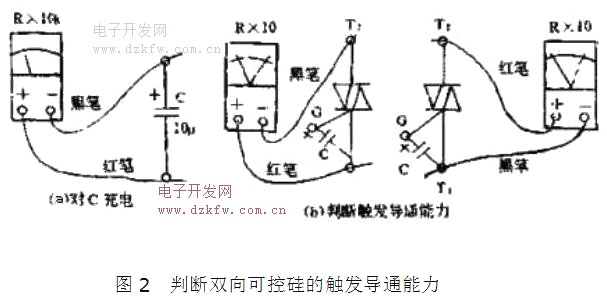 檢查觸發導通能力。如圖2所示,取一只10uF左右的電解電容器,將萬用表置于Rx10k檔(V電壓),對電解電容器充電3~5s后用來代替圖1中的短路線,即利用電容器上所充的電壓作為觸發信號,然后再將萬用表置于Rx10檔,照圖2(b)連接好后進行測試。測試時,電容C的極性可任意連接,同樣是碰觸一下后離開,觀察表頭指針偏轉情況,如果測試結果與“方法二’相同,就證明雙向可控硅是好的。