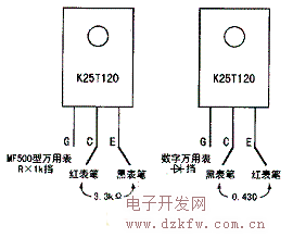 將萬用表撥在R×10KΩ擋,用黑表筆接IGBT 的漏極(D),紅表筆接IGBT 的源極(S),此時萬用表的指針指在無窮處。用手指同時觸及一下柵極(G)和漏極(D),這時IGBT 被觸發(fā)導通,萬用表的指針擺向阻值較小的方向,并能站住指示在某一位置。然后再用手指同時觸及一下源極(S)和柵極(G),這時IGBT 被阻斷,萬用表的指針回到無窮處。此時即可判斷IGBT 是好的。注意:若進第二次測量時,應短接一下源極(S)和柵極(G)。任何指針式萬用表皆可用于檢測IGBT。注意判斷IGBT 好壞時,一定要將萬用表撥在R×10KΩ擋,因R×1K Ω擋以下各檔萬用表內(nèi)部電池電壓太低,檢測好壞時不能使IGBT 導通,而無法判斷IGBT 的好壞。此方法同 樣也可以用于檢測功率場效應晶體管(P-MOSFET)的好壞。