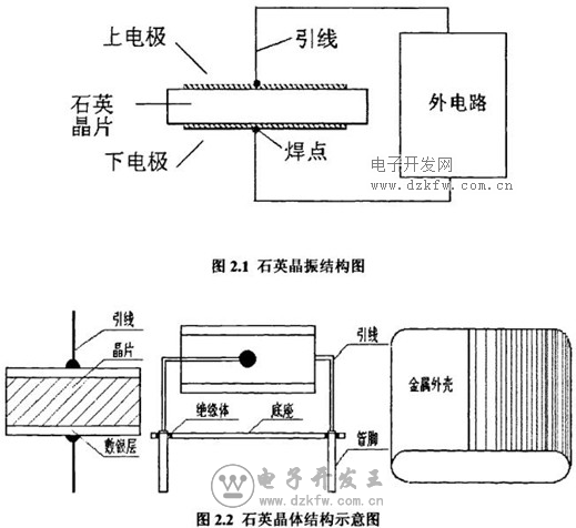 石英晶體諧振器是利用石英晶體的壓電效應制成的一種諧振器件,其基本結構為:從一塊石英晶體上按一定方位角切下薄片(簡稱為晶片,它可以是正方形、矩形或圓形等),在它的兩個對應面上涂敷銀層作為電極,在每個電極上各焊根引線接到管腳上,再加上封裝外殼就構成了石英晶體振蕩器,簡稱為石英晶體或晶體、晶振。其產品一般用金屬外殼封裝,也有用玻璃殼、陶瓷或塑料封裝的。圖2.1是石英晶振結構圖。圖2.2是一種金屬外殼封裝的石英晶體結構示意圖。