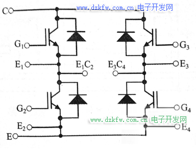 全橋(Full bridge)模塊也稱為4 in 1模塊,用于直接構(gòu)成全橋電路;也可以用模塊中的2個半橋電路并聯(lián)構(gòu)成電流規(guī)格大2倍的半橋模塊,即將分別將G1和G3、G2和G4、E1和E3、E2和E4、E1C2和E3短接。