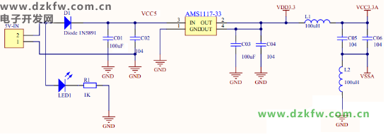 以下是用穩壓芯片將5V的電源轉換成3.3V的電壓電路原理圖。