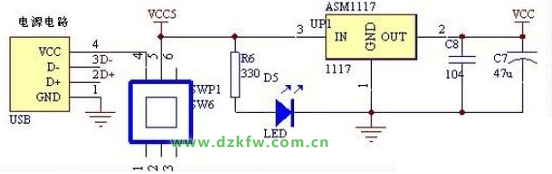 R6是D5的限流電阻,作用是使顯示發光二極管D5在上電時能工作在正常的狀態下;C7和C8都是輸出濾波電容,作用是減小輸出電壓汶波并抑制ASM1117的自激振蕩,C8是高頻濾波電容,C7是低頻濾波電容。圖中已經標出了C8容量是0.1微法,C7是47微法,R6的阻值是3030歐。