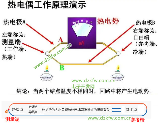 將兩種不同資料的導體或半導體A和B焊接起來,構成一個閉合回路。當導體A和B的兩個執著點1和2之間存在溫差時,兩者之間便產生電動勢,因此在回路中構成一個大小的電流,這 種現象稱為熱電效應。熱電偶就是應用這一效應來工作的。