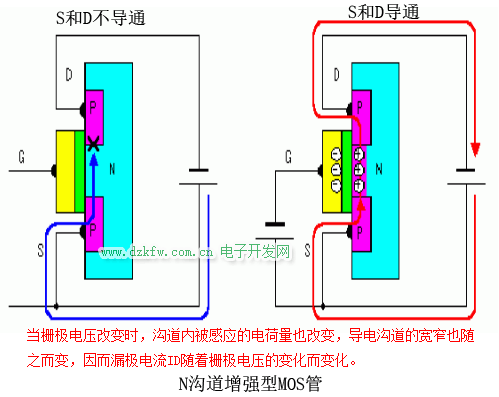 當柵極電壓改變時,溝道內被感應的電荷量也改變,導電溝道的寬窄也隨之而變,因而漏極電流ID隨著柵極電壓的變化而變化。