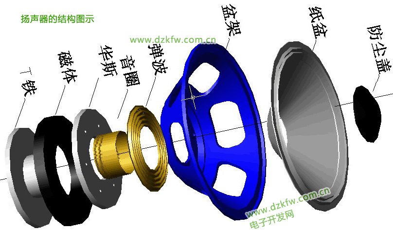 輸入音頻電流的音圈感應擊N極S極改變的交變磁場于揚聲口磁路系統中的N極S極不變的固定磁場推動作用使音圈產生振動,從而勞動粘在音圈上的紙盆振動,推動容器振動產生聲音。電動式揚聲器主要是由,磁體,上下夾板,極心,音圈和振膜等部件組成。磁體位于上下夾板之間,它的作用是產生一個均勻的磁場。