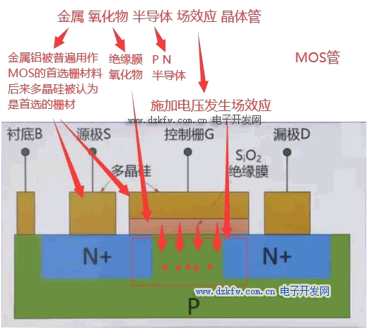 我們前面說過MOS管全名為:金屬 (Metal)—氧化物 (Oxide)—半導(dǎo)體 (Semiconductor)場(chǎng)效應(yīng)晶體管,為什么會(huì)叫這個(gè)名字,我們通過上面的組成結(jié)構(gòu)用圖來說明: