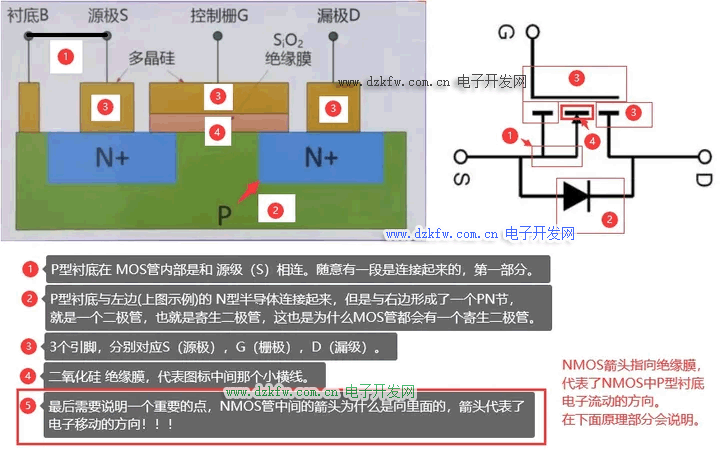 記住 MOS管有 三個(gè)引腳名稱:G:gate 柵極;S:source 源極;D:drain 漏極。