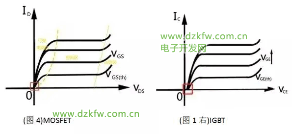 其中當(dāng)VDS>0且較小時(shí),ID隨著VDS的增大而增大,這部分區(qū)域在MOSFET中稱為可變電阻區(qū),在IGBT中稱為非飽和區(qū);當(dāng)VDS繼續(xù)增大,ID-VDS的斜率逐漸減小為0時(shí),該部分區(qū)域在MOSFET中稱為恒流區(qū),在IGBT中稱為飽和區(qū);當(dāng)VDS增加到雪崩擊穿時(shí),該區(qū)域在MOSFET和IGBT中都稱為擊穿區(qū)。IGBT的柵極-發(fā)射極電壓VGE類似于MOSFET的柵極-源極電壓VGS,集電極電流IC類似于漏極電流ID,集電極-發(fā)射極電壓VCE類似于漏源電壓VDS。MOSFET與IGBT在線性區(qū)之間存在差異(紅框所標(biāo)位置)。