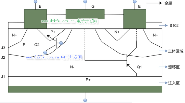 為了更好了解IGBT,下面我們?cè)賮?lái)看看它的內(nèi)部結(jié)構(gòu):一般,IGBT 有三個(gè)端子:集電極、發(fā)射極和柵極,他們都是附有金屬層。但是,柵極端子上的金屬材料具有二氧化硅層。IGBT結(jié)構(gòu)其實(shí)就相當(dāng)于是一個(gè)四層半導(dǎo)體的器件。四層器件是通過(guò)組合 PNP 和 NPN 晶體管來(lái)實(shí)現(xiàn)的,它們構(gòu)成了 P-N-P-N 排列。如下圖所示,小編簡(jiǎn)單繪制了一下IGBT的一個(gè)內(nèi)部結(jié)構(gòu)。