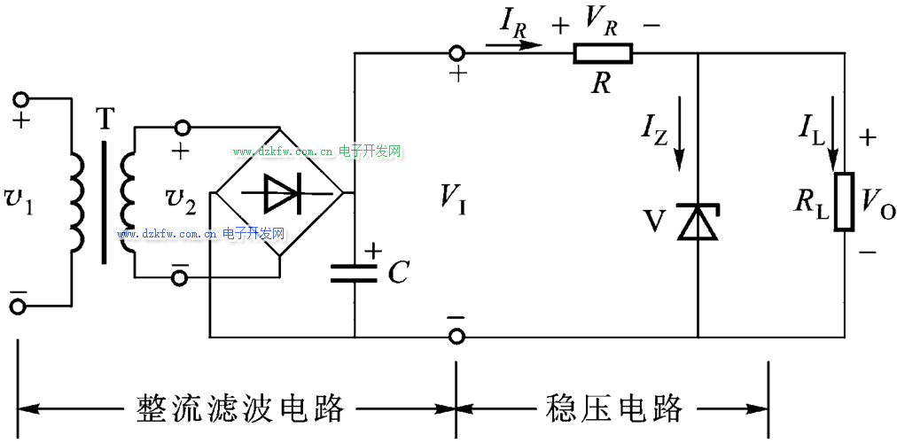 并聯(lián)穩(wěn)壓電路。如下圖所示,穩(wěn)壓二極管VD并聯(lián)在輸出端,VD上的電壓即為輸出電壓。這種簡單并聯(lián)穩(wěn)壓電路主要應(yīng)用在輸入電壓變化不大、負(fù)載電流較小的場所。