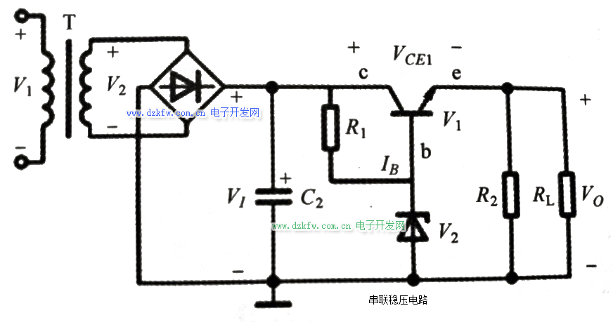 (2) 串聯(lián)穩(wěn)壓電路。如圖2-60所示,由于串聯(lián)在輸出電路中的調(diào)整管VT的基極電壓被穩(wěn)壓二極管VD所穩(wěn)定,所以當(dāng)輸出電壓發(fā)作變化時(shí),調(diào)整管VT的基-射極間電壓相應(yīng)變化,使得VT的管壓降向相反方向變化,從而使輸出電壓根本堅(jiān)持穩(wěn)定。