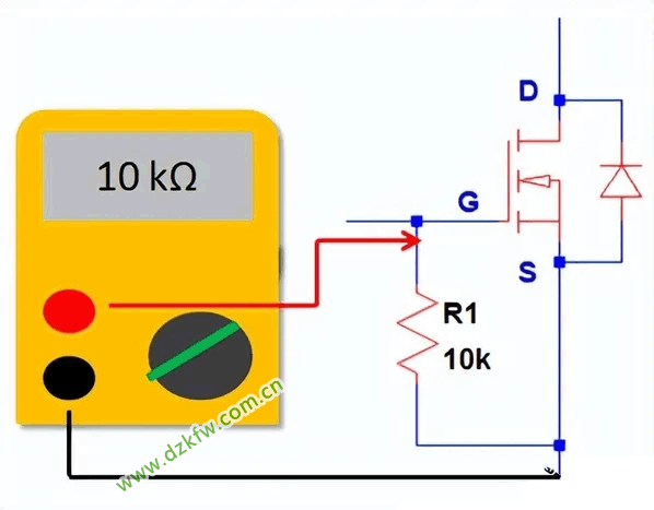 如果你測(cè)量mos管 端子到端子的電阻,你應(yīng)該考慮相關(guān)的電阻,因?yàn)檫@些電阻會(huì)影響讀數(shù)。例如在上面的電路中,當(dāng)你測(cè)量柵極到源極的電阻時(shí),你讀取的不是高電阻,而是 R1 的值,即 10k。移除 10k 電阻會(huì)使讀數(shù)變高。