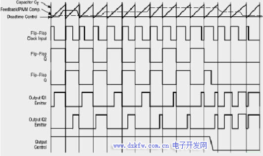 輸出脈沖的寬度是通過電容CT.上的正極性鋸齒波電壓與另外兩個控制信號進行比較來實現。功率輸出管Q1和Q2受控于或非門。當雙穩觸發器的時鐘信號為低電平時才會被選通,即只有在鋸齒波電壓大于控制信號期間才會被選通。當控制信號增大,輸出脈沖的寬度將減小。參見下圖。