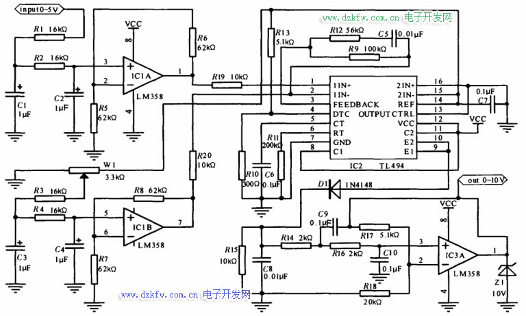 為了把脈寬變化的方波信號轉換為大小變化的直流信號,通過開關二極管D1、 電容C8進行整流濾波。R15作為整流濾波的輸出負載,還在脈沖截止期間為C8提供放電回路,使C8上的電壓與TL494輸出的脈寬成正比。為使輸出電壓進一步平滑、提高帶負載能力以及使輸出電壓在0~10V之間變化,又加入了一級壓控電壓源二階低通濾波電路。在圖中所示元件參數下,最大的直流輸出電壓是10V IC3A輸出端接的10V穩壓二極管, 是保證在意外的情況下,使輸出電不大于10V。