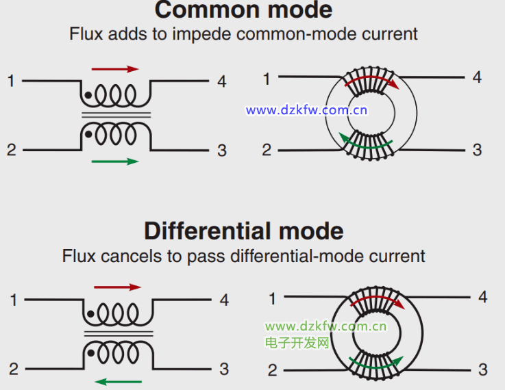 根據(jù)右手螺旋定理,當差模電流流過共模電感線圈時,產(chǎn)生2個相互抵消的磁場;當共模電流流過共模線圈時,產(chǎn)生2個相互增強的磁場,使整個線圈阻抗變高,衰減共模電流。