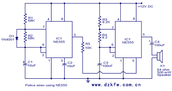 很多電子電路NE555定時器IC這里已經出版,這僅僅是另一個one.Here是定時器IC NE55基于警笛的電路圖。該電路使用兩個選用NE555定時器IC和他們每個非穩態multivibrators.The電路有線可以從什么之間的6至15V直流供電,相當loud.By連接一個額外的功率放大器輸出,你可以進一步增加響度。