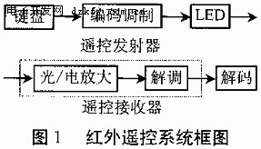 通用紅外遙控系統由發射和接收兩大部分組成,應用編/解碼專用集成電路芯片來進行控制操作,如圖1所示。發射部分包括鍵盤矩陣、編碼調制、LED紅外發送器;接收部分包括光、電轉換放大器、解調、解碼電路。