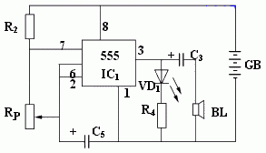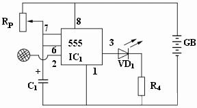 圖5-56是它的電路圖,它與音響器不同的是沒有電容,并將電容處斷開。先將音響器調響后,拆去電容,用兩個手指捏住導線的兩個端頭,這時喇叭發出高的音調。隨著手指捏住松緊程度不同,喇叭發出時高時低、時響時斷、如同鳥叫一般的聲音。調整可調電阻阻值,會發出不同音調,模仿鳥鳴和其他音響。