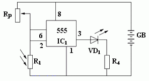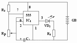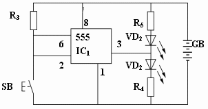 先用硬紙做一個燈塔模型。圖5-47是它的電路圖,它只取閃光電路的一部分——一個綠發光二極管作為塔燈。最后調整好閃爍時間。