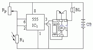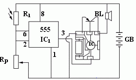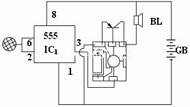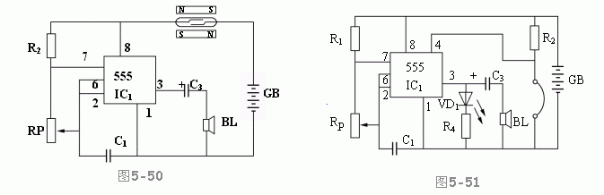 圖5-50是它的電路圖,它是在音響電路中接入干簧管,再將干簧管放入兩塊相吸引的磁鐵之間,這時,干簧管并不閉合,電路不導通。當移動一塊磁鐵后干簧管立即閉合,電路導通報警。制作時先把干簧管安放在門窗的木框上,同時把一塊磁鐵固定在干簧管的上方,把另一塊磁鐵安放在門窗對著干簧管處的下方,注意一定要使這兩塊磁鐵相吸,這時干簧管不導通,喇叭不發出音響。一旦門窗打開,干簧管被上方磁鐵吸引閉合,電路導通,發出音響報警。