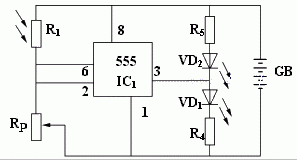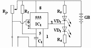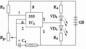 圖5-48是它的電路圖,它與閃光電路相比,集成電路的腳①是單獨與負極連接,而電容與R5卻是經過干簧管與負極連接。先按圖14做一個一碰便可以翻倒的靶牌。在靶子的底部固定一塊磁鐵,將電路中的干簧管固定在與磁鐵相對應的支架底板上。綠色發光二極管放置在靶心位置上,紅色發光二極管誘因在支架的底部。游藝時,將靶牌放在暗處,干簧管在磁場作用下導通,兩個發光二極管相互閃光,綠色發光二極管指示靶心。當靶子被擊倒后,雖然干簧管失去了磁場的作用電路斷開,但這時電路并未全部不通,紅色發光二極管不會常亮,表示擊中靶子。如果把靶牌放到運動的車模上,打靶更加緊張有趣。