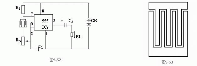 圖5-52是它的電路圖,它是在音響電路中從兩個電阻之間引出一個探頭改為雨水報警器的。用覆銅板照圖5-53做一個探頭,接到音響電路中,當雨水滴在探頭上,使電路導通,便會發出音響。這個報警器還可以作為各種遇水報警裝置。