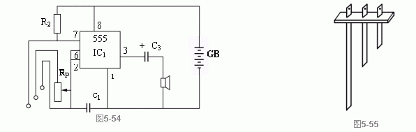 水能導電,也就有電阻存在。圖5-54就是利用電阻值的不同,發出不同音調制作成高低水位報警器,它與雨水報警器中的探頭不同。用導線按照圖5-55做成水位探頭,接到電路中去。當水位低時,A與B導通,因有可調電阻,阻值較大發出低音;當水位升高A與C也導通,這時A與C電阻阻值因為沒有可調電阻遠遠小于A與B的電阻值,因此電流通過A與C,報警器便發出高音。