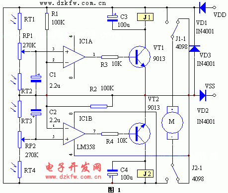 電路原理圖如圖1所示,雙運放LM358與R1、R2構成兩個電壓比較器,參考電壓為VDD(+12V)的 1/2。光敏電阻 RT1、RT2與電位器 RP1和光敏電阻RT3、RT4與電位器RP2分別構成光敏傳感電路,該電路的特殊之處在于能根據環境光線的強弱進行自動補償。如圖2所示,將RT1和RT3安裝在垂直遮陽板的一側,RT4和RT2安裝在另一側。當RT1、RT2、RT3和RT4同時受環境自然光線作用時,RP1和RP2的中心點電壓不變。如果只有RT1、RT3受太陽光照射,RT1的內阻減小,LM358的③腳電位升高,①腳輸出高電平,三極管VT1飽和導通,繼電器K1導通,其轉換觸點3與觸點1閉合。同時RT3內阻減小,LM358的⑤腳電位下降,K2不動作,其轉換觸點3與靜觸點2閉合,電機M正轉;同理,如果只有RT2、RT4受太陽光照射,繼電器K2導通,K1斷開,電機M反轉。當轉到垂直遮陽板兩側的光照度相同時,繼由器K1、K2都導通,電機M才停轉。在太陽不停地偏移過程中,垂直遮陽板兩側光照度的強弱不斷地交替變化,電機M轉——停、轉——停,使太陽能接收裝置始終面朝太陽。4只光敏電阻這樣交叉安排的優點是:(l)LM358的③腳電位升高時,⑤腳電位則降低,LM358的⑤腳電位升高時,③腳電位則降低,可使電機的正反轉工作既干脆又可靠;(2)可直接用安裝電路板的外殼兼作垂直遮陽板,避免將光敏電阻RT2、RT3引至蔽陰處的麻煩。