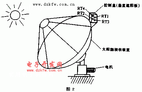 整個太陽能接收裝置的結構如圖2。兼作垂直遮陽板的外殼最好使用無反射的深顏色材料,四只光敏電阻的參數要求一致,即亮、暗電阻相等且成線性變化。安裝時,四只光敏電阻不要凸出外殼的表面,最好凹進一點,以免散射陽光的干擾;垂直遮陽板(即控制盒)裝在接收裝置的邊緣,既能隨之轉動又不受其反射光的強烈照射。凋試時,首先不讓太陽直接照到四只光敏電阻上,然后調節RP1、RI2,使LM358兩正向輸人端的電位相等且高于反向輸人端0.5V-1V。調試完畢后,讓陽光照到垂直遮陽板上,接收裝置即可自動跟蹤太陽了。