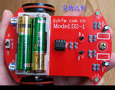 在電池盒內裝入2節AA電池,開關撥在“ON”位置上,小車正確的行駛反相是沿萬向輪方向行駛,如果按住左邊的光敏電阻,小車的右側的車輪應該轉動,按住右邊的光敏電阻,小車的左側的車輪應該轉動,如果小車后退行駛可以同時交換兩個電機的接線,如果一側正常另一側后退,只要交換后退一側電機接線即可。