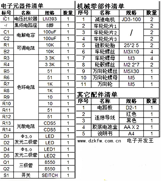 本著從簡到繁的原則,我們首先來制作一款由數字電路來控制的智能循跡小車,在組裝過程中我們不但能熟悉機械原理還能逐步學習到:光電傳感器、電壓比較器、電機驅動電路等相關電子知識。