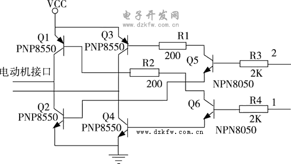 智能小車驅動電路是一個全橋驅動電路, Q1,Q2, Q3, Q4四個三極管組成4個橋臂, Q5 控制Q2和Q3的導通和關斷, Q6控制Q1 和Q4 的導通和關斷, 驅動電路分別用于后輪動力驅動電路和前輪方向驅動電路。當1管腳為高電平, 2管腳為低電平時時Q1 和Q4 導通, Q2和Q3截止, 電動機帶動車輪運轉; 當1管腳為低電平, 2管腳為高電平時時Q1和Q4截止, Q2和Q3導通, 電動機帶動車輪反向運轉。