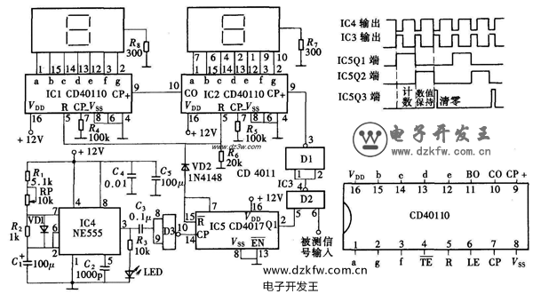 由頻率的定義可知,頻率是脈沖信號每秒鐘振動的次數。因此,如果用一個電子計數器和一個控制閘門,設法讓被測信號只輸入1s。那么該計數器所顯示的數值即是該被測信號的頻率。電子數字式頻率計就是按照這個原理設計的。下面介紹結構較為簡單的兩位數字式頻率計,電路組成如圖所示。它由兩位計數器、控制閘門、秒時基發(fā)生電路和被測信號輸入電路組成。