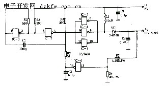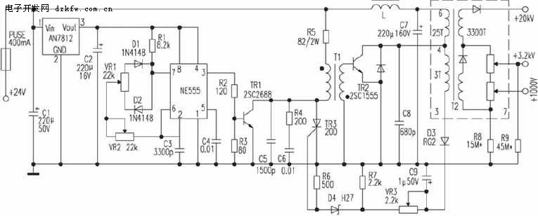 一些照相機CRT使用11.4cm(4.5英寸)純平面CRT作為顯示部件,其高壓部件的陽極電壓為+20kV,聚焦極電壓為+3.2kV,加速極電壓為+1000V,高壓部件供電為直流24V。以下電路是為替換維修這些顯示器的高壓部件而設計(電路選自網絡文章,原作者不詳)。該電路的設計也可為其他升壓電路設計提供參考。