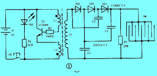 電路中,發光二極管VD1和限流電阻器R1構成指示燈電路,用來指示電路通斷狀態及顯示電池電能的耗損情況。