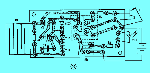 圖2所示為該電蚊拍的印制電路板焊接圖。印制電路板最好采用環氧基質單面銅箔板制作,實際尺寸約為56mm×28mm。