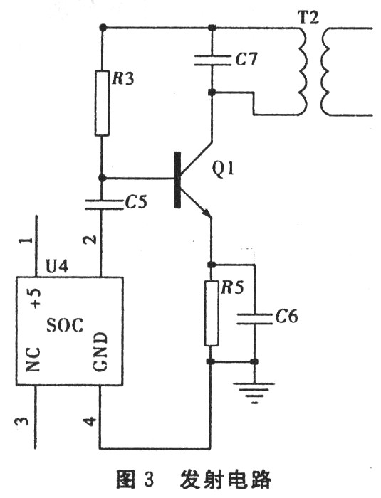 如圖3,主振電路采用2 MHz有源晶振作為振蕩器。有源晶振輸出的方波,經過二階低通濾波器濾除高次諧波,得到穩定的正弦波輸出,經三極管13003及其外圍電路組成的丙類放大電路后輸出至線圈與電容組成的并聯諧振回路輻射出去.為接收部分提供能量。