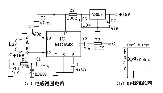 BB809 是變?nèi)荻䴓O管,圖中電位器VR1 對(duì)+15V 進(jìn)行分壓,調(diào)節(jié)該電位器可獲得不同的電壓輸出,該電壓通過R1 加到變?nèi)荻䴓O管BB809 上可獲得不同的電容量。測量被測電感Lx時(shí),只需將Lx 接到圖中A、B 兩點(diǎn)中,然后調(diào)節(jié)電位器VR1 使電路諧振,在MC1648 的3腳會(huì)輸出一定頻率的振蕩信號(hào),用頻率計(jì)測量C 點(diǎn)的頻率值,就可通過計(jì)算得出Lx 值。